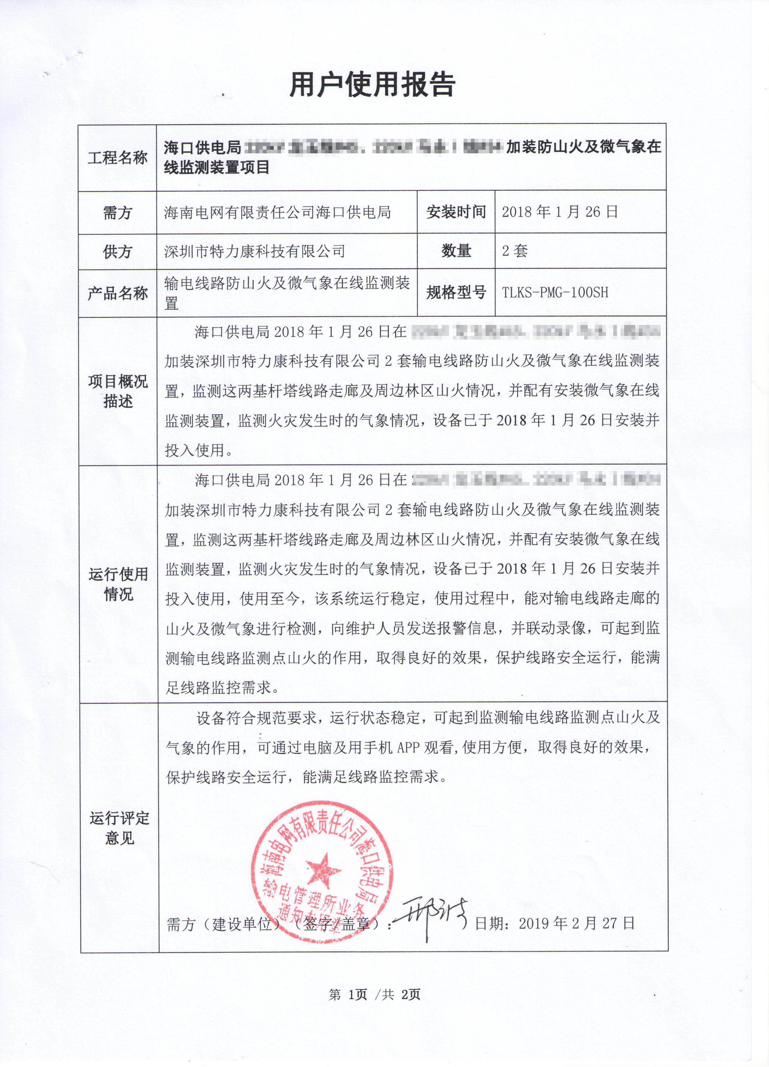 2018年1月26日海口供電單位在轄區(qū)管理線路安裝我司(深圳市特力康科技有限公司)輸電線路防外破裝置,該裝置應(yīng)局方要求加裝了微氣象監(jiān)測(cè)裝置及防山火裝置,監(jiān)測(cè)塔桿線路走廊以及周邊森林區(qū)域山火情況。