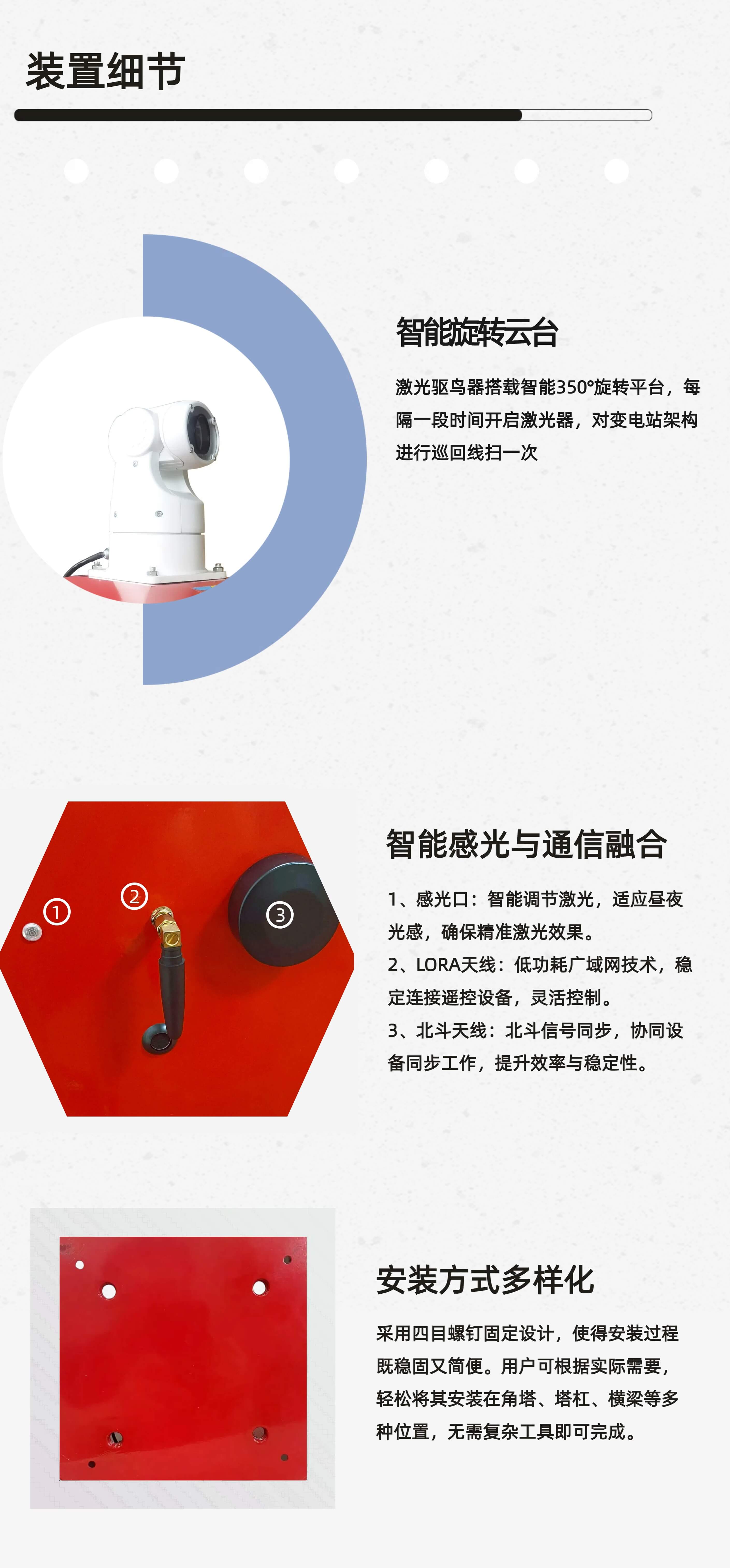 激光驅(qū)鳥器主要由一字線激光器和智能云臺兩個重要部件組成。一字線激光器射出一字線的激光,同市面上大多數(shù)點狀式激光有所不同,一字線對驅(qū)趕變電站架構(gòu)上的鳥類更為方便;激光器裝載在智能云臺上,通過云臺的轉(zhuǎn)動進行掃描。整機具備欠壓過壓保護、遙控器遠(yuǎn)程遙控、定時功能、分時控保護激光器的功能,安裝使用簡單方便。