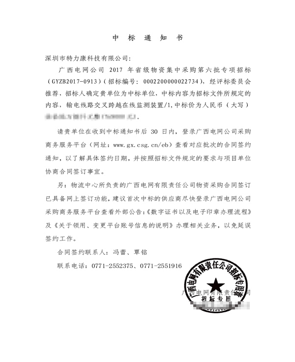 特力康中標(biāo)國網(wǎng)黑龍江送變電工程公司的2024年度第18次物資類競爭性談判采購項目——慶陽驅(qū)鳥器物資框 特力康中標(biāo)國網(wǎng)甘肅省電力公司省管產(chǎn)業(yè)單位2024年第五次物資競爭性談判授權(quán)采購項目 中標(biāo)喜訊:深圳市特力康科技有限公司成功入圍許繼集團(tuán)綜合能源公司輸電線路視頻在線監(jiān)測裝置模塊集采項目 中標(biāo)喜訊:特力康成功中標(biāo)國網(wǎng)重慶市電力公司渝中一片區(qū)項目 特力康成功中標(biāo)國網(wǎng)天津市電力公司2024年第二次?物?資招標(biāo)項目 特力康中標(biāo)國網(wǎng)安徽省電力有限公司蕪湖供電公司2024年3月非物質(zhì)采購項目 精準(zhǔn)捕捉 “微氣象”:浙江電力用特力康預(yù)警系統(tǒng)筑牢電網(wǎng)氣候防線 守護(hù) “電力咽喉”:湖南電力投用百套特力康三跨 4G 監(jiān)控球,筑牢安全防線 貴州電力裝特力康電網(wǎng)架空線路覆冰監(jiān)測系統(tǒng),精準(zhǔn)防冰保電網(wǎng)過冬? 百套落地山西電網(wǎng)!特力康輕量化輸電架空線路監(jiān)拍裝置,筑牢輸電安全網(wǎng) 破解采空區(qū)隱患:山西電力裝特力康通用型監(jiān)測裝置,守鐵塔穩(wěn)運行 四川電力用特力康架空輸電線路山火監(jiān)測裝置,筑牢林區(qū)輸電 “防火墻”? 遼寧電力啟用特力康多視角監(jiān)拍裝置,全維度守護(hù)輸電安全? 破解黃土高原沉降難題:山西電力用特力康北斗裝置守桿塔安全? 寧夏配電線路安裝了我司防外破電子化智能警示牌