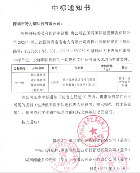 特力康中標(biāo)2023年第二次國(guó)網(wǎng)湖南省電力有限公司直租業(yè)務(wù)招標(biāo)采購(gòu)可視化圖像監(jiān)測(cè)