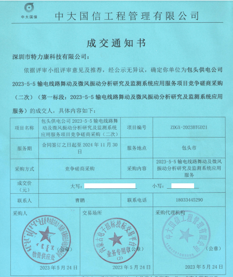 依據(jù)評審小組評審意見及推薦,經(jīng)公示無異議,確定我司為包頭供電公司2023-5-5輸電線路舞動及微風(fēng)振動分析研究及監(jiān)測系統(tǒng)應(yīng)用服務(wù)項目競爭磋商采購(二次) (第一標(biāo)段: 2023-5-5 輸電線路舞動及微風(fēng)振動分析研究及監(jiān)測系統(tǒng)應(yīng)用服務(wù))的成交人,具體內(nèi)容如下: