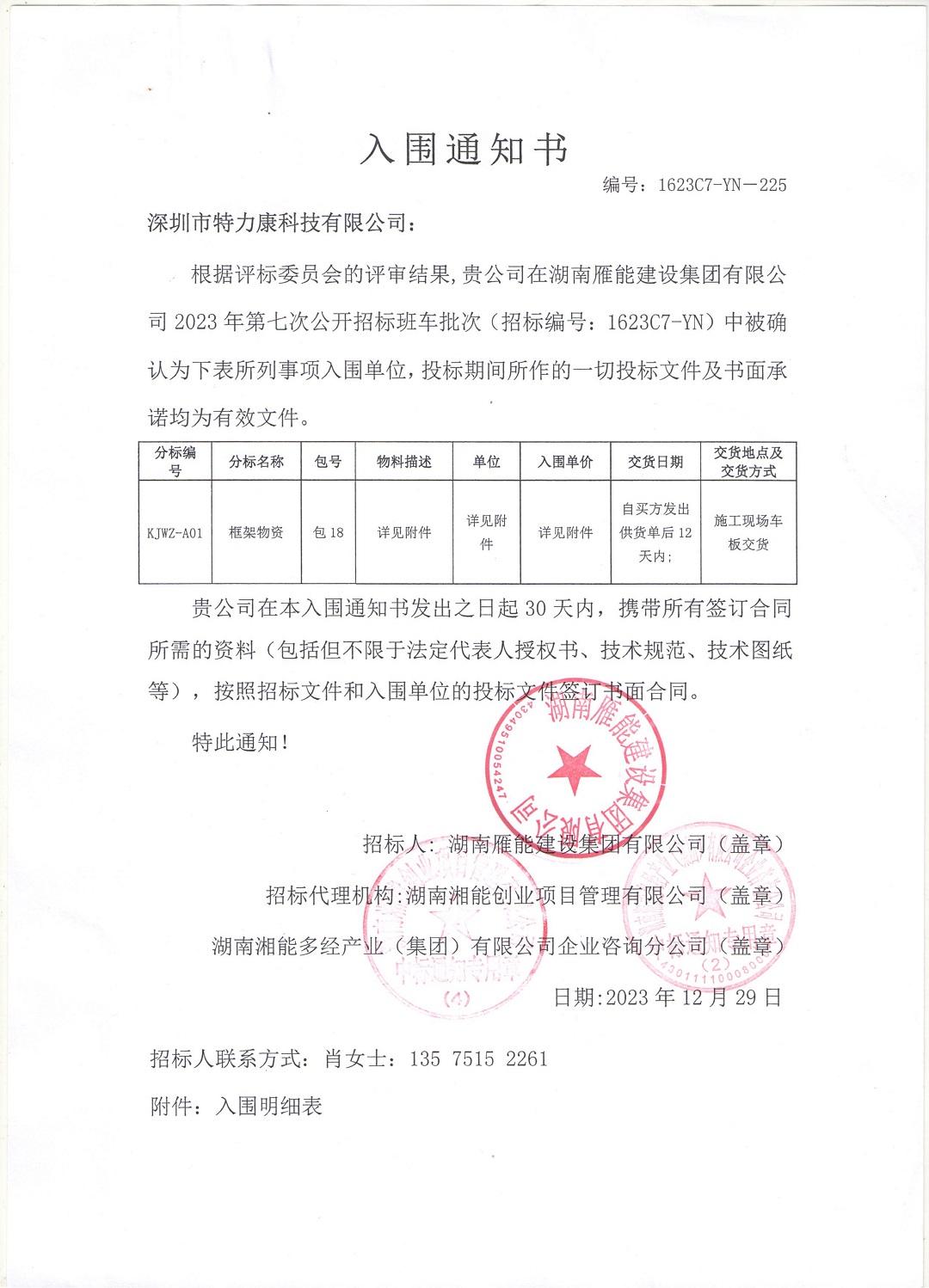 根據(jù)評標委員會的評審結果,我司在湖南雁能建設集團有限公司2023年第七次公開招標班車批次(招標編號:1623C7-YN)中表現(xiàn)出色,經(jīng)過嚴格評審,我司被確認為本次招標項目的入圍單位。