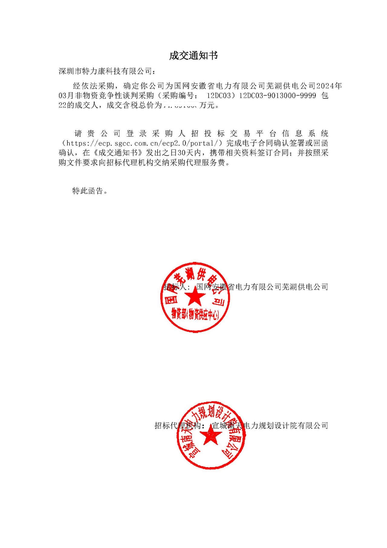 2024年4月1日——深圳市特力康科技有限公司(以下簡稱“特力康”)近日成功中標國網(wǎng)安徽省電力有限公司蕪湖供電公司2024年3月非物資競爭性談判采購項目(采購編號:12DCO3)中的相關(guān)包件。