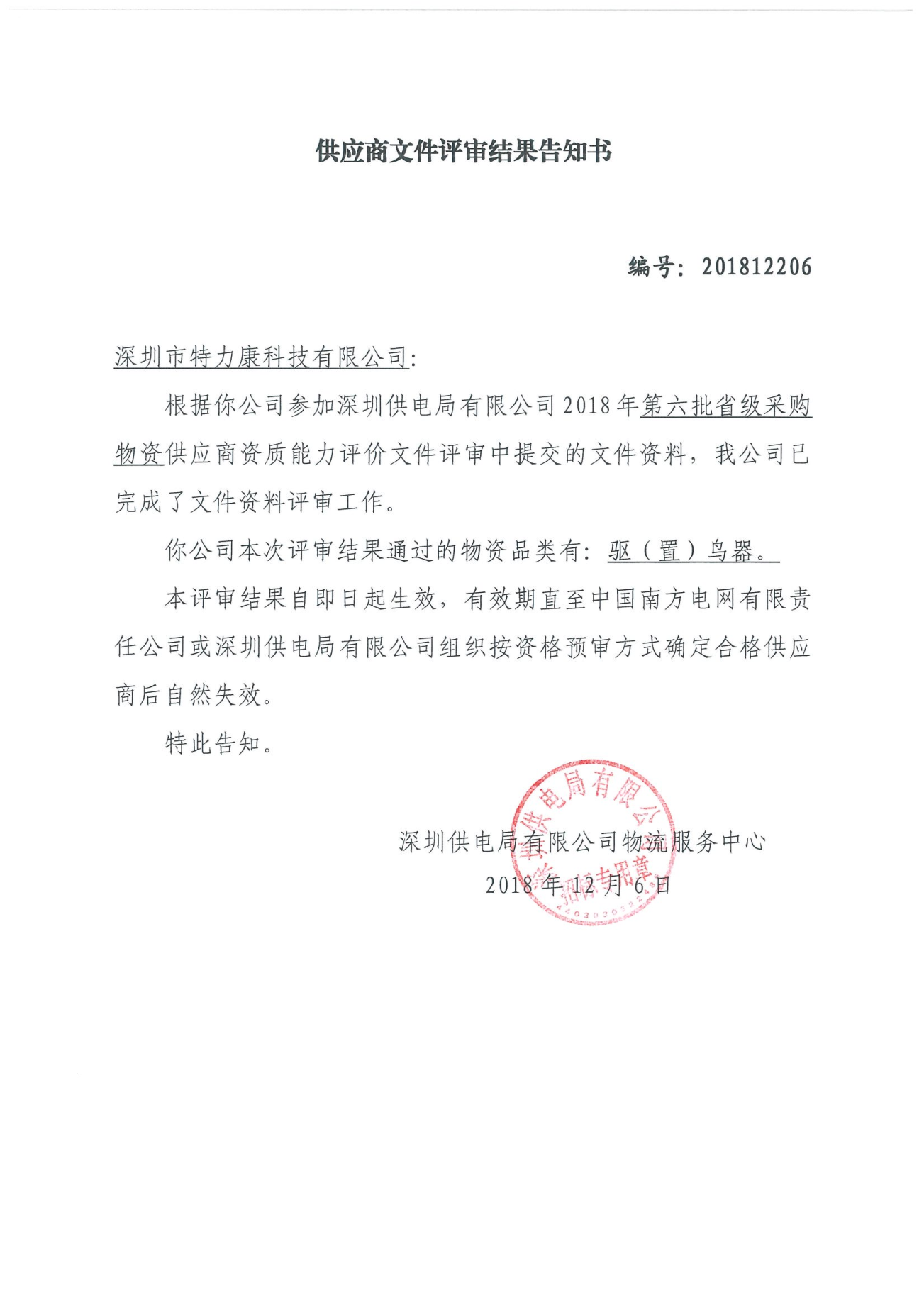 南方電網(wǎng)深圳供電有限公司2018年第六批驅(qū)(置)鳥器框架項目評審工作已結(jié)束,經(jīng)評審委員會評審,經(jīng)南網(wǎng)深圳電力公司招投標領(lǐng)導(dǎo)小組批準,我司被確定為此次驅(qū)(置)鳥器框架中標單位現(xiàn)將公告公示。