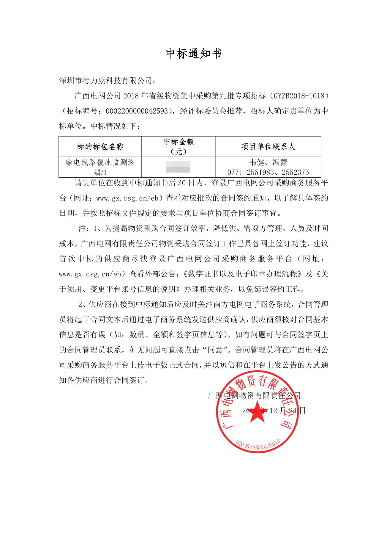 南方電網(wǎng)廣西供電局2018省級物資集中采購第九批專項招標(biāo)項目評審工作已結(jié)束,經(jīng)評審委員會評審,經(jīng)南網(wǎng)廣西供電公司電力公司招投標(biāo)領(lǐng)導(dǎo)小組批準(zhǔn),將評審結(jié)果公示。我司被確定為此項目簽約單位現(xiàn)將公告公示。