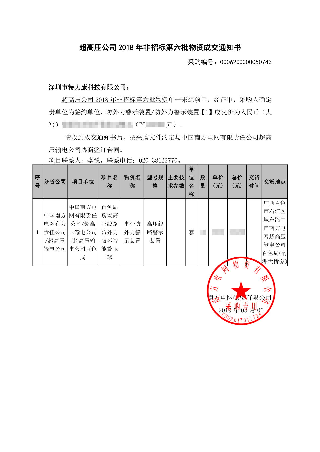 南方電網廣西百色超高壓局2018非招標第六批物資評審工作已結束,經評審委員會推薦,經南網廣西供電公司電力公司招投標領導小組批準,確定我司為廣西百色超高壓局2018非招標第六批物資防外力警示裝置中標單位。