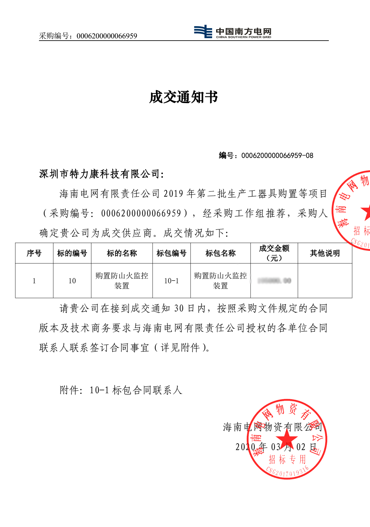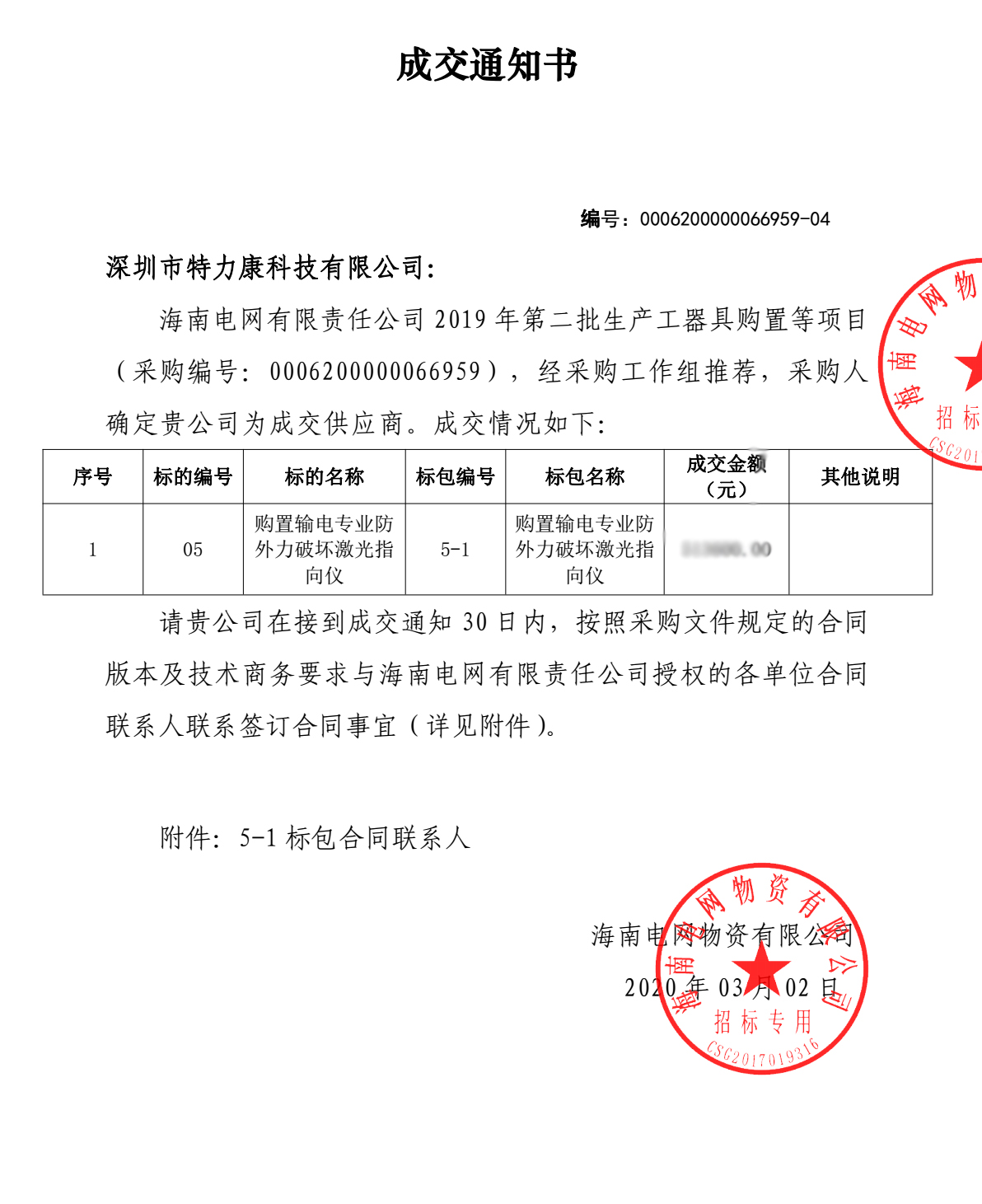 海南電網(wǎng)有限責任公司2019年第二批生產(chǎn)工器具購等項目(采購編號; 0000660509 )采購工作已完成。經(jīng)采購工作組推薦,采購人確定我司(深圳市特力康科技有限公司)成為本此標包5-1購置輸電專業(yè)防外力破壞激光指向儀及標包10-1購置防山火監(jiān)控裝置的成交供應(yīng)商,附成交通知書如下: