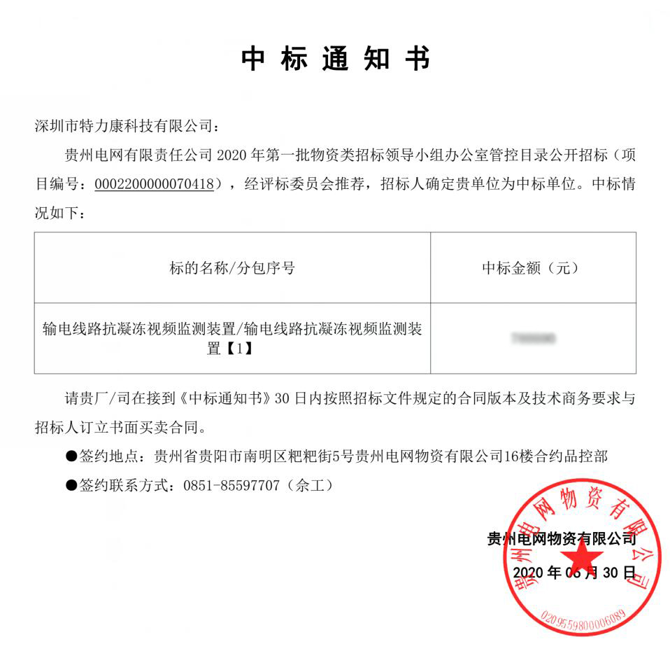 我司(深圳市特力康科技有限公司)在投標(biāo)貴州電網(wǎng)有限責(zé)任公司2020年第一批物資類招標(biāo)領(lǐng)導(dǎo)小組辦公室管控目錄公開招標(biāo)(項目編號: 0000000070418) 中輸電線路抗凝凍視頻監(jiān)測裝置標(biāo)包,經(jīng)評標(biāo)委員會推薦,招標(biāo)人確定我司為中標(biāo)單位。特發(fā)中標(biāo)通知書,如下: