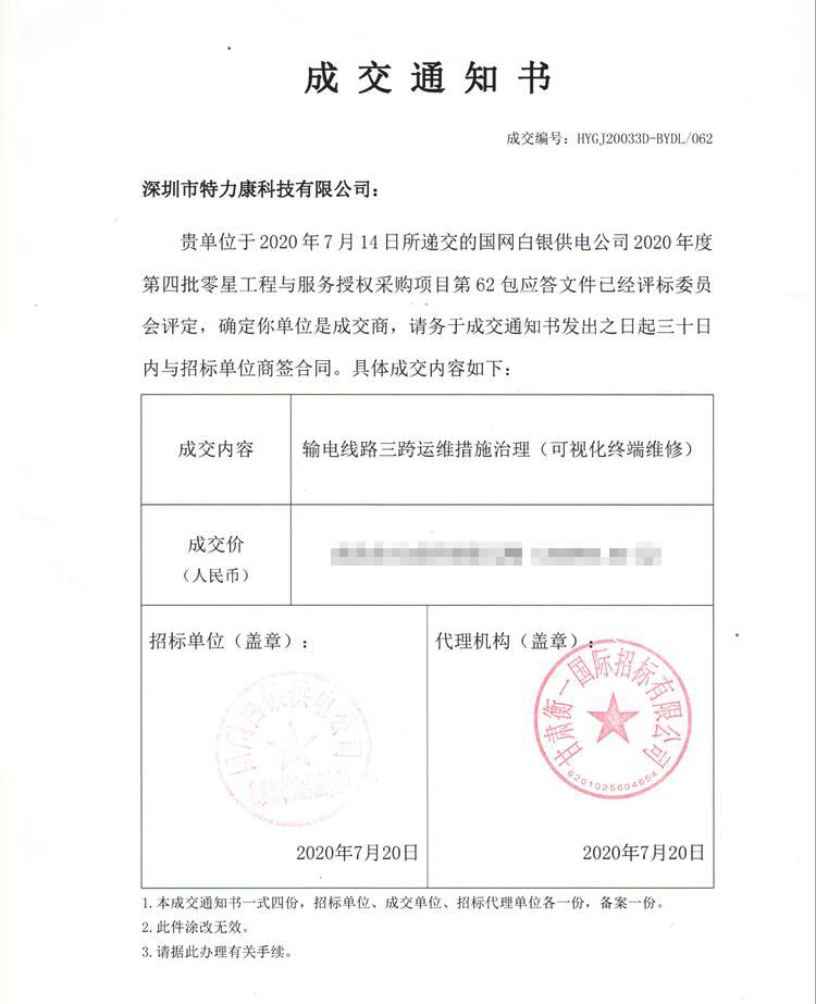 我司于2020年7月14日參加了國網(wǎng)白銀供電公司2020年度第四批零星工程與服務授權(quán)采購項目第62包輸電線路三跨運維措施治理(可視化終端維修)的投標工作,所遞交的應答文件經(jīng)評標委員會評定,確定我司(深圳市特力康科技有限公司)是成交商,具體成交內(nèi)容如下: