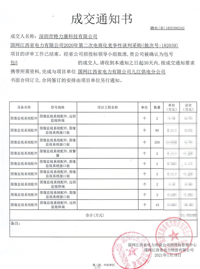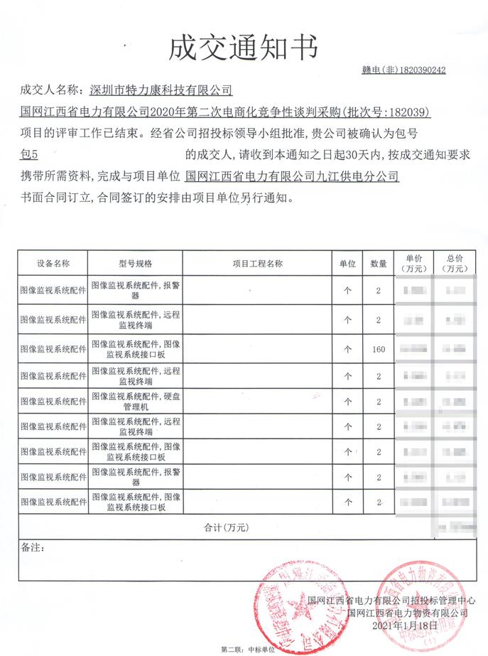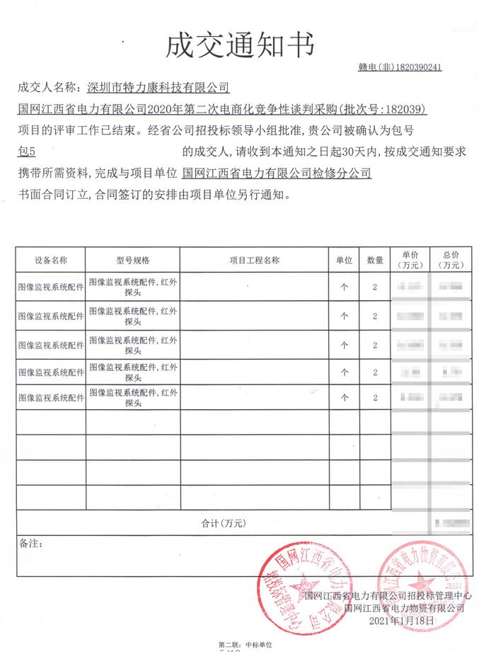 國網(wǎng)江西省電力有限公司2020年第二次電商化競爭性談判采購(批次號:182039)項目的評審工作已結(jié)束。經(jīng)省公司招投標(biāo)領(lǐng)導(dǎo)小組批準(zhǔn),我司(深圳市特力康科技有限公司)被確認(rèn)為包號包5(圖像監(jiān)視系統(tǒng)配件)的成交人,成交通知如下: