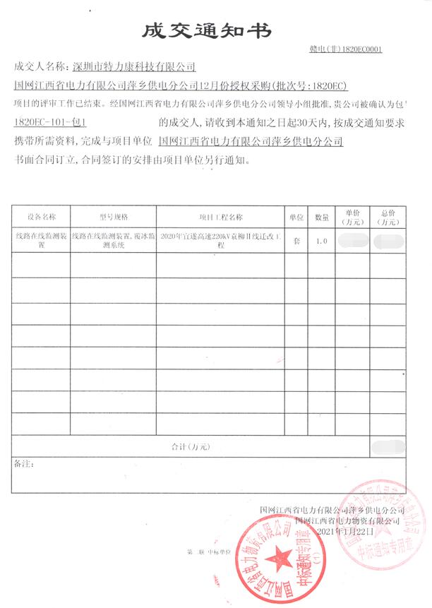 國網(wǎng)江西省電力有限公司萍鄉(xiāng)供電分公司12月份授權(quán)采購(批次號: 1820EC)項目的評審工作已結(jié)束。經(jīng)國網(wǎng)江西省電力有限公司萍鄉(xiāng)供電分公間領(lǐng)導(dǎo)小組批準,我司(深圳市特力康科技有限公司)被確認為包1820EC- 101-包1(線路在線監(jiān)測裝置,覆冰監(jiān)測系統(tǒng))的成交人,成交通知如下:
