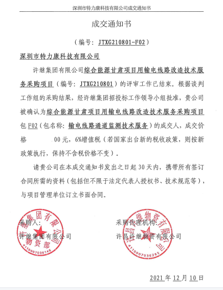 許繼集團(tuán)有限公司綜合能源甘肅項(xiàng)目用輸電線(xiàn)路改造技術(shù)服務(wù)采購(gòu)項(xiàng)且(編號(hào): JTXG210801) 的評(píng)審工作已結(jié)束。根據(jù)談判工作組的采購(gòu)結(jié)果,經(jīng)許北集團(tuán)招投標(biāo)工作領(lǐng)導(dǎo)小組批準(zhǔn)。我司被確認(rèn)為綜合能源甘肅項(xiàng)目用輸電線(xiàn)路改造技術(shù)服務(wù)采購(gòu)項(xiàng)目包F02(包名稱(chēng):輸電線(xiàn)路通道監(jiān)測(cè)技術(shù)服務(wù))的成交人,成交通知如下: