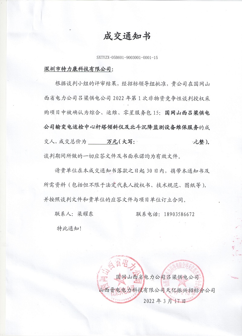 根據談判小組的評審結果,經招標領導組批準,我司在國網山西省電力公司呂梁供電公司2022年第1次非物資競爭性談判授權采購項目中被確認為綜合、運維、零星服務包15:國網山西呂梁供電公司輸變電運檢中心桿塔傾斜儀及北斗沉降監(jiān)測設備維保服務的成交人,成交通知如下: